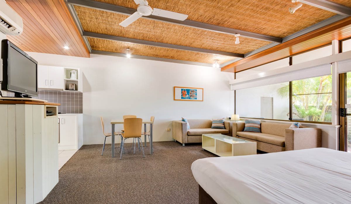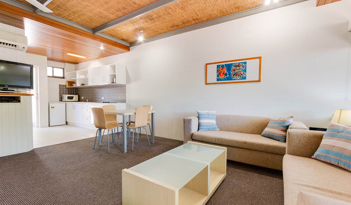 Approximately 51msq internally, plus private courtyard, these fully self contained units offer excellent facilities and space. This renovated room includes a King size bed (able to be split into two singles), 2 two seater lounges, kitchenette including microwave, fridge, toaster, tea & coffee making facilities, dining area, washing machine and dryer, flat screen television, DVD Player, CD/IPOD, ceiling fan, reverse cycle air-conditioning and private courtyard with barbecue. (Max 2 Guests)