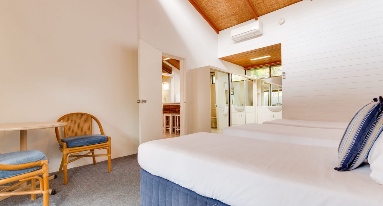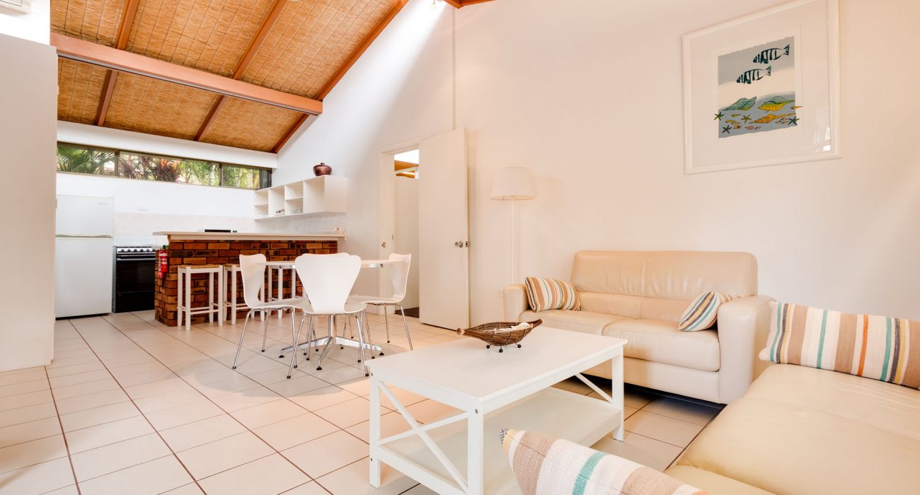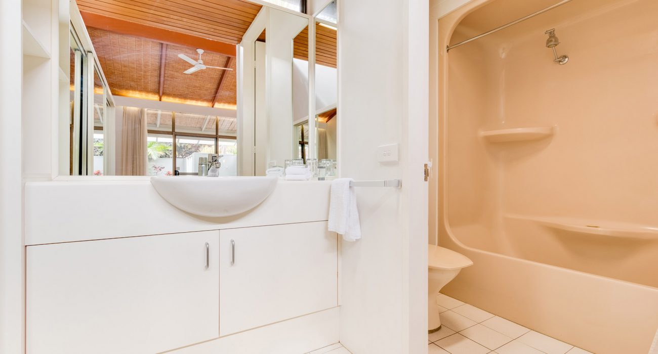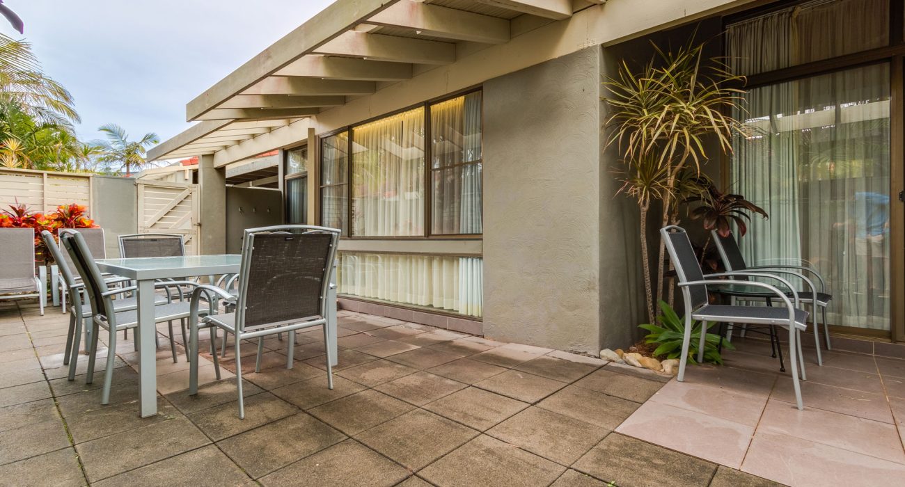 Approximately 96sqm internally, plus over 30sqm of private paved garden courtyard with outdoor furniture and ‘Webber’ BBQ. This is the ideal quiet, conveniently located, ground floor villa for families. Reverse cycle air-conditioning and ceiling fans throughout. Sun block-out blinds and curtains. Two bedrooms: spacious master bedroom with king size bed, ensuite with bath and overhead shower, flat-screen LCD TV; Second bedroom with 3 single beds, flat screen LCD TV, own separate bathroom with bath and overhead shower. Full kitchen including, fridge/freezer, oven/stove top, microwave, dishwasher, toaster, tea & coffee making facilities Separate dining and lounge area with flat-screen LCD TV & DVD player. Laundry includes washing machine and dryer. Villa also includes its own private carport and free WiFi. (sleeps maximum 5 guests)