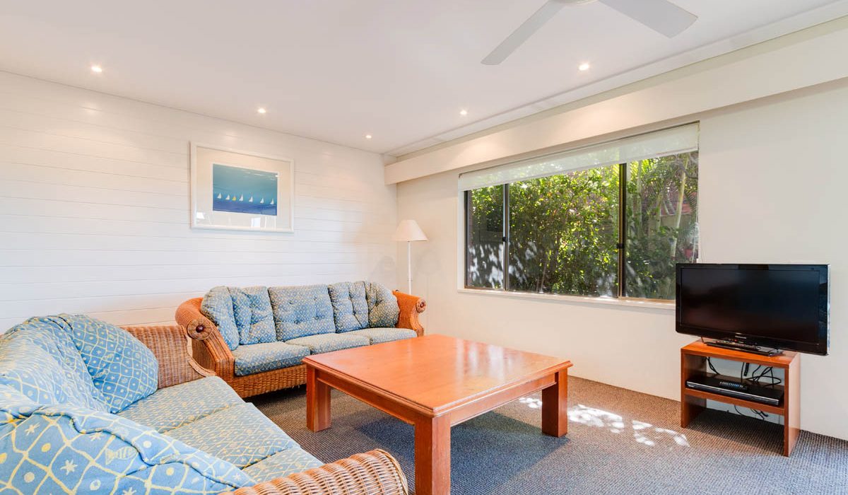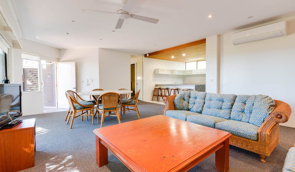 Approximately 135msq internally, this 3 bedroom ground floor apartment is ideal for large families or groups. This villa includes Two x bedrooms with a king size bed (able to be split into two singles), and the third room consisting of 4 bunk beds. There are 2 x bathrooms with walk in showers. Full kitchen including, fridge, oven/ stove top, microwave, dishwasher, toaster, tea & coffee making facilities, separate dining and lounge area, washing machine and dryer, 2 x televisions, ceiling fans, reverse cycle air conditioning and private paved courtyard with views of the ocean. (max 8 guests)