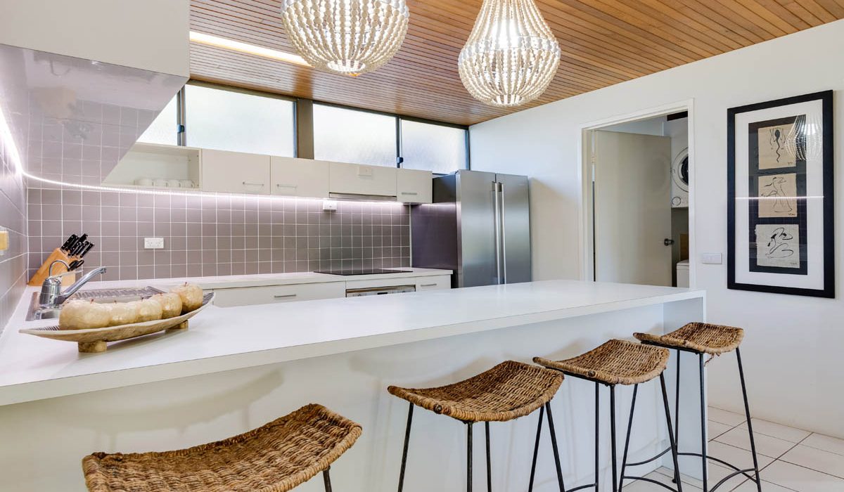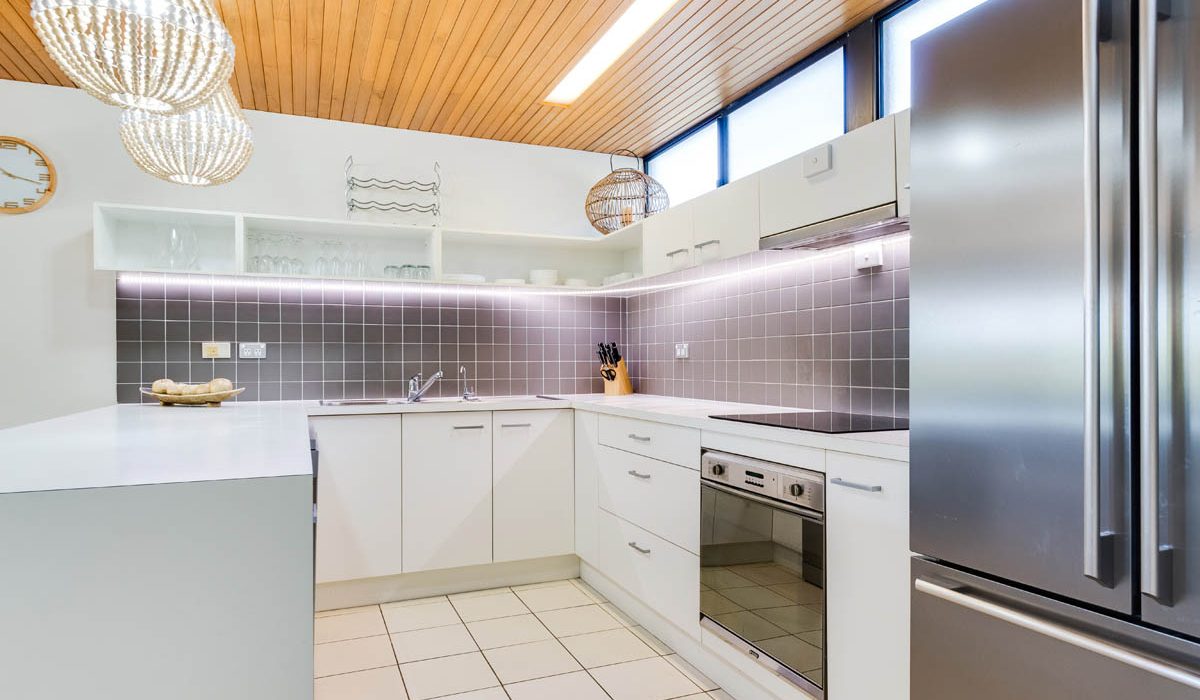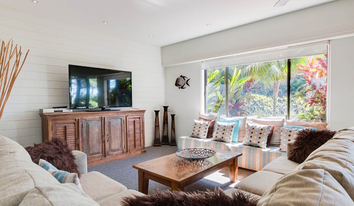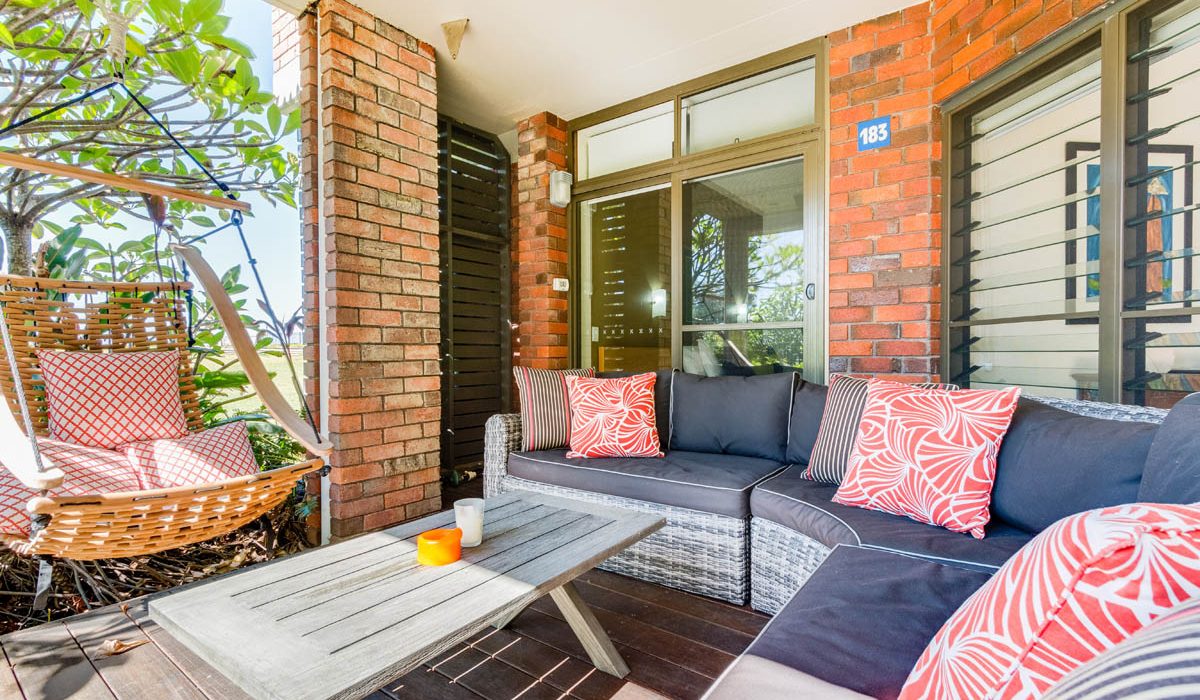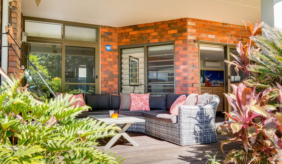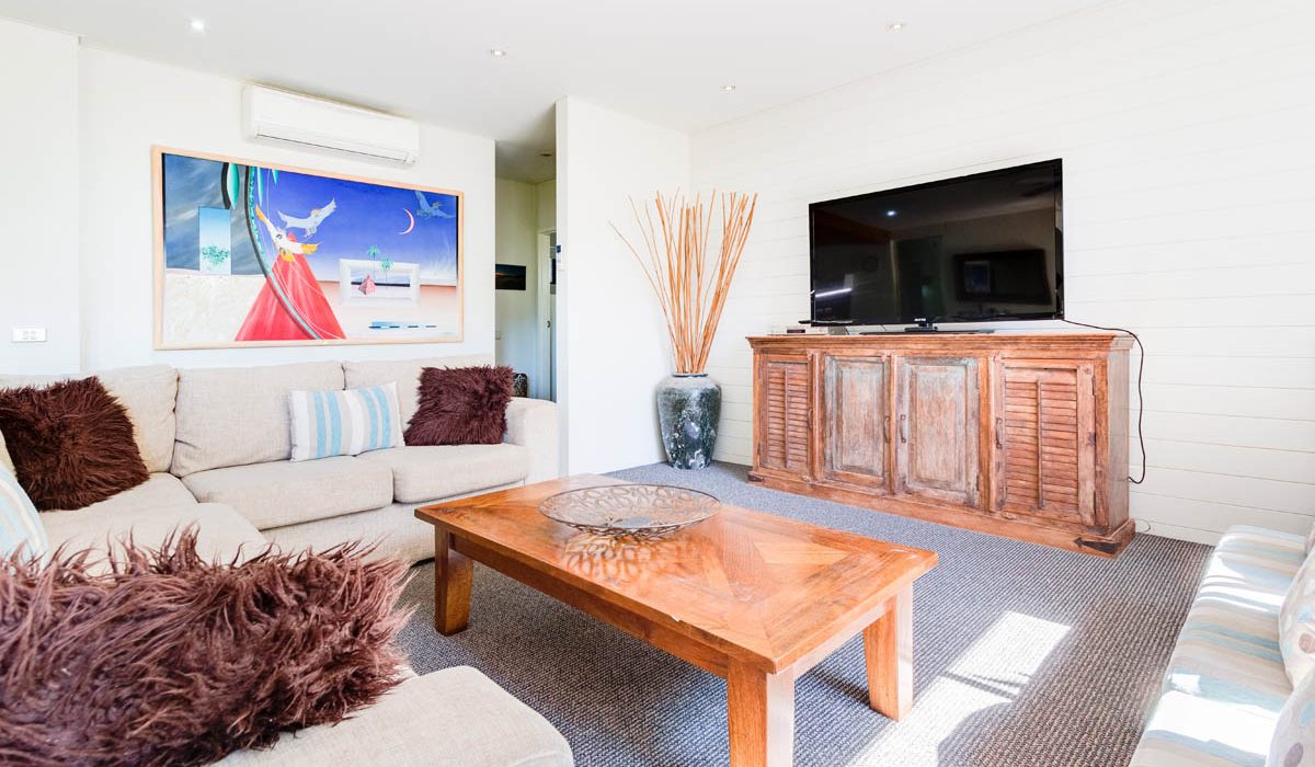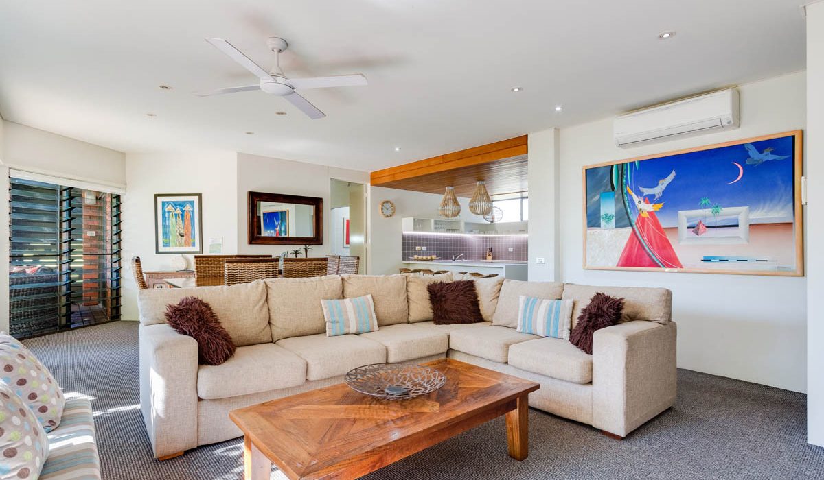 Approximately 135msq internally, this fully renovated 3 bedroom ground floor apartment is ideal for large families or groups. The villa includes main bedroom with posturepedic Queen bed, Second bedroom with a king size bed (able to be split into two singles), and the third room consisting of 4 bunk beds. There are 2 x bathrooms with walk in showers and heated towel rails. Full kitchen including breakfast bar, fridge, oven/ stove top, microwave, dishwasher, toaster, tea & coffee making facilities, separate dining and lounge area adjoins the kitchen with its own enclosed laundry area, washing machine and dryer, The spacious living room offers 50″ flat screen television, Main bedroom also features a flat screen TV, ceiling fans in all rooms, reverse cycle air conditioning and private landscaped outdoor area with day bed (max 8 guests).
