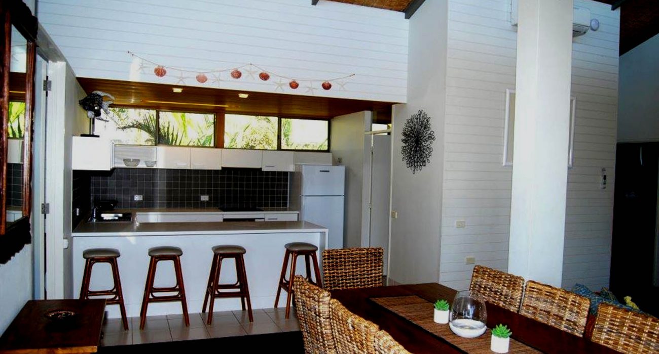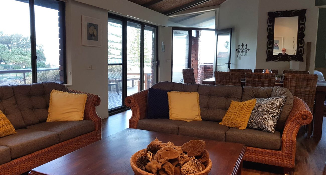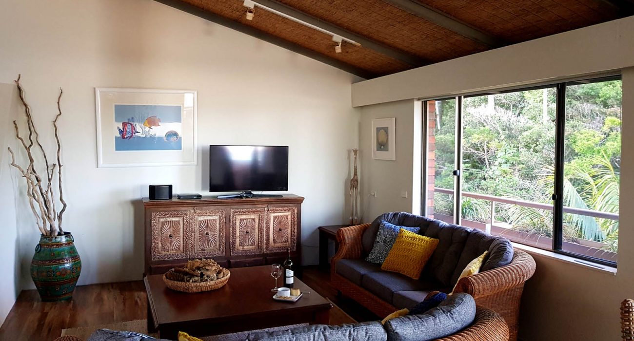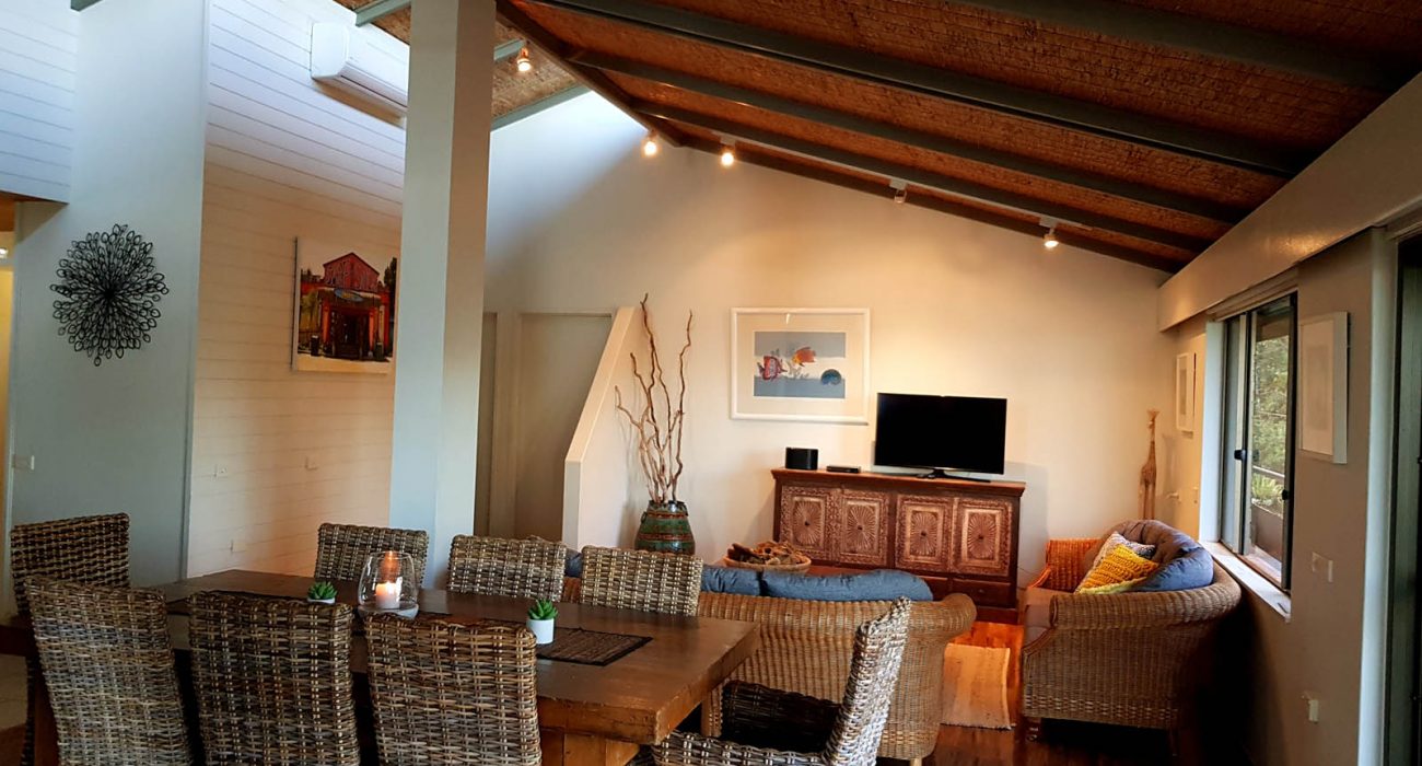 Superb uninterrupted beach and rain forest views are a feature of this first floor villa. The 220 msq of internal space includes 3 bedrooms, 2 with king size beds and a third with 4 bunk beds. There are two bathrooms,  and a separate laundry with washing machine and dryer. A well equipped kitchen includes oven, stove top, “Nespresso” coffee machine, fridge, microwave and dishwasher. Relax in the comfort with ceiling fans, reverse cycle air conditioning and two flat screen TV’s  (one which is a smart TV), Blue-ray player and Blue-tooth speaker for your entertainment. Complimentary WiFi.  Enjoy comfortable dining for eight or step out onto the charming patio for al fresco dining, with the waves breaking just metres away and the black cockatoos calling from the rain forest across the creek.