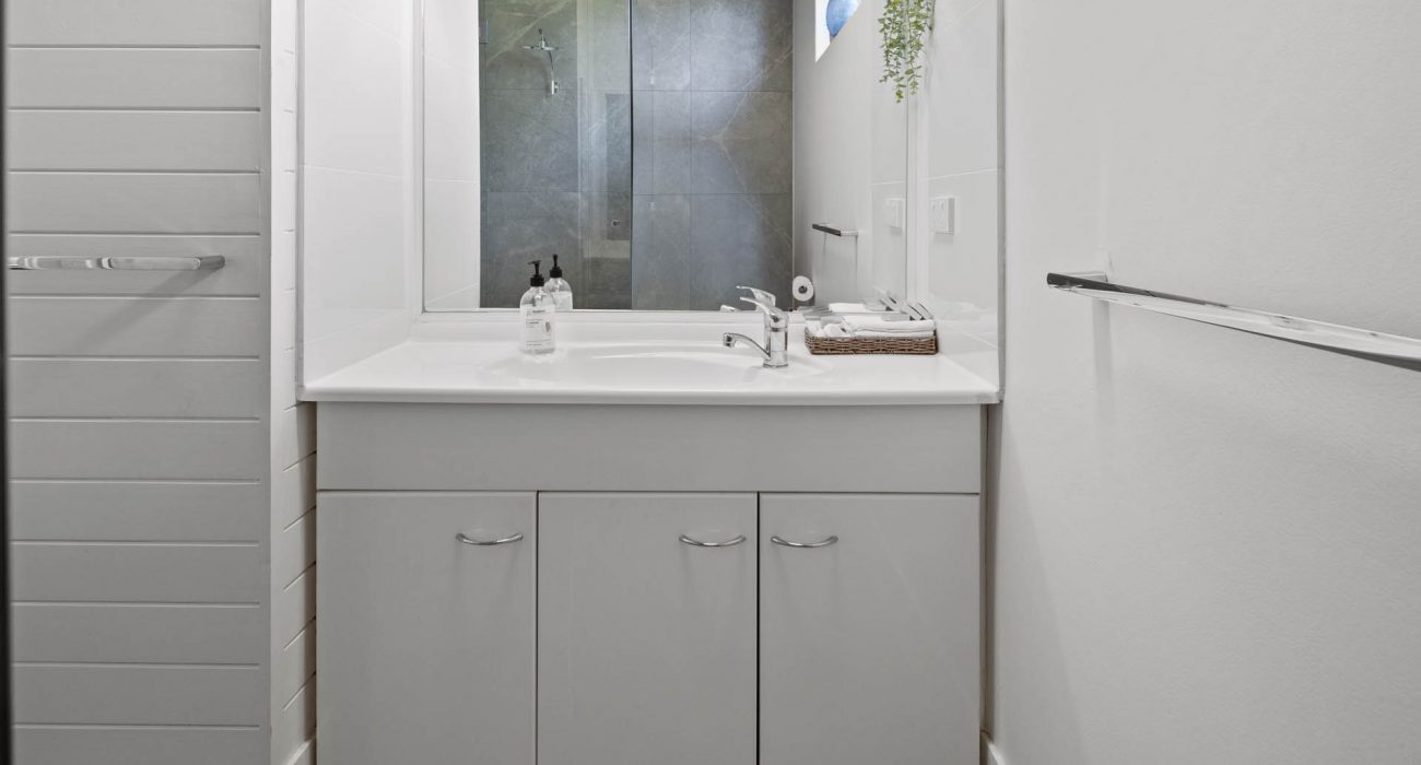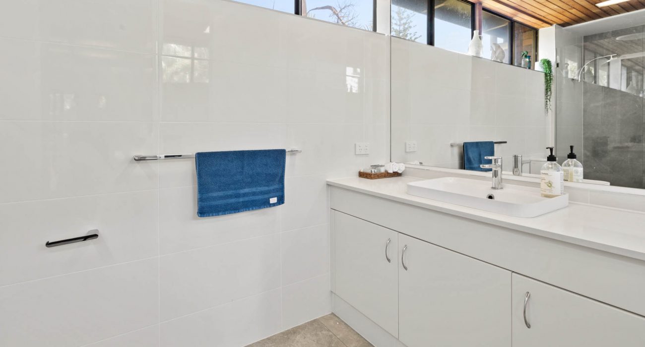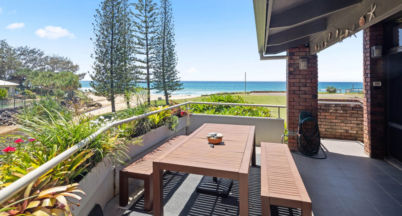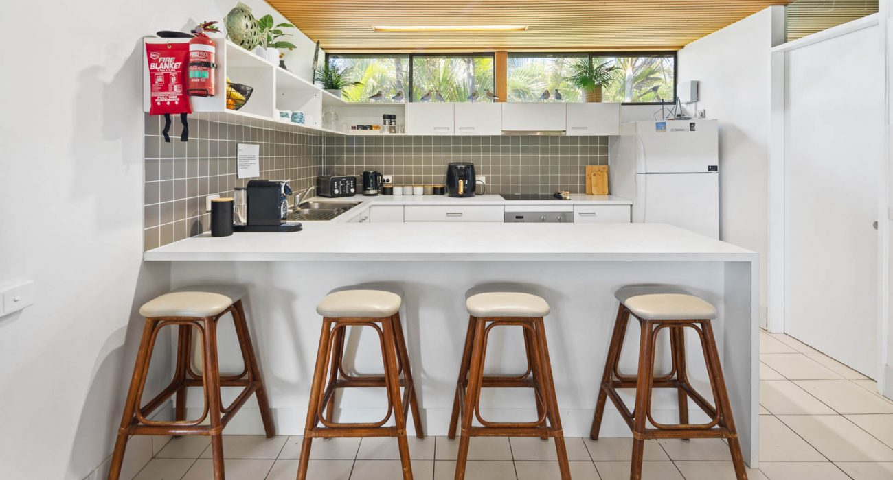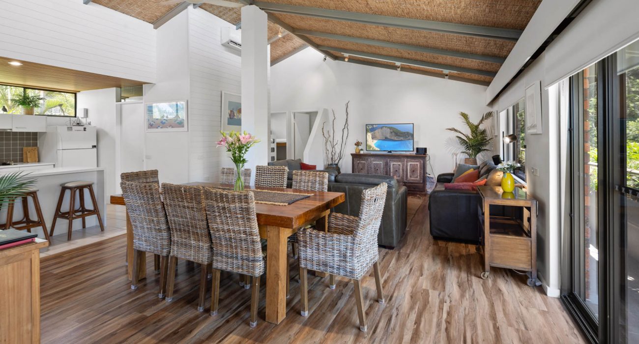Superb uninterrupted beach and rain forest views are a feature of this first floor villa. The 220 msq of internal space includes 3 bedrooms, 2 with king size beds and a third with 4 bunk beds. There are two bathrooms, and a separate laundry with washing machine and dryer. A well equipped kitchen includes oven, stove top, “Nespresso” coffee machine, fridge, microwave and dishwasher. Relax in the comfort with ceiling fans, reverse cycle air conditioning and two flat screen TV’s (one which is a smart TV), Blue-ray player and Blue-tooth speaker for your entertainment. Complimentary WiFi. Enjoy comfortable dining for eight or step out onto the charming patio for al fresco dining, with the waves breaking just metres away and the black cockatoos calling from the rain forest across the creek.