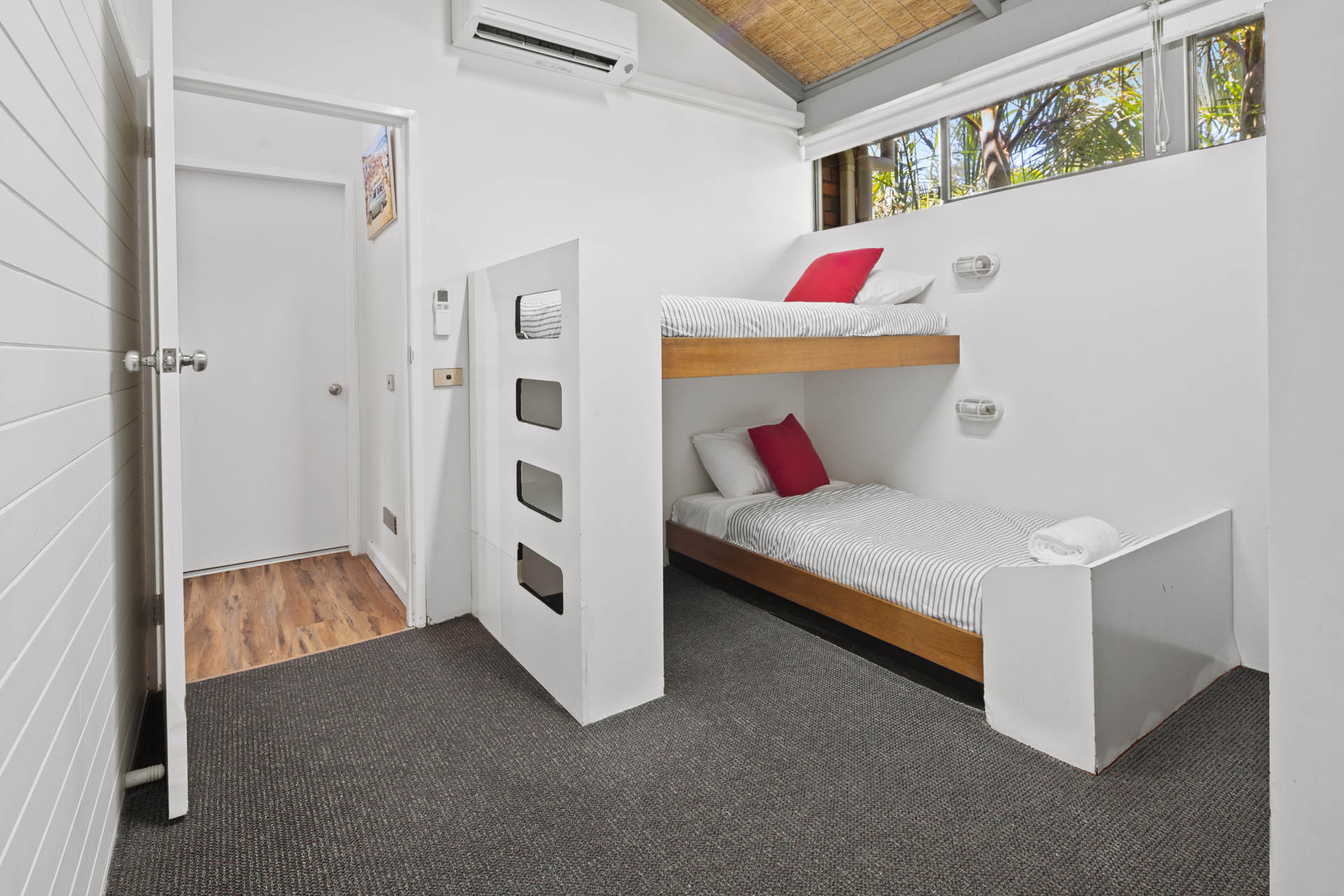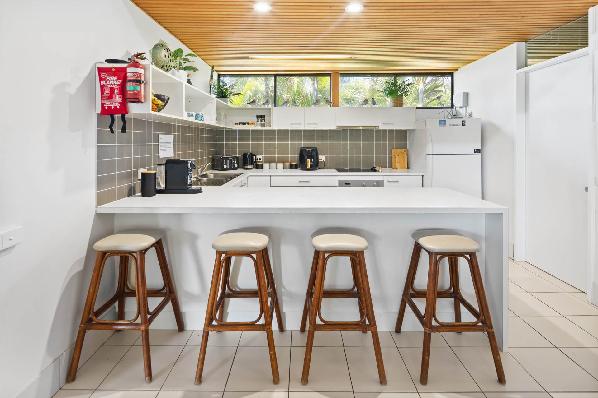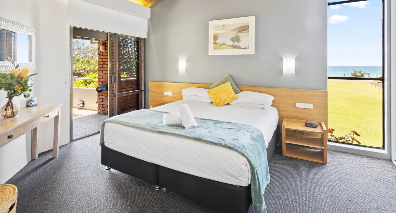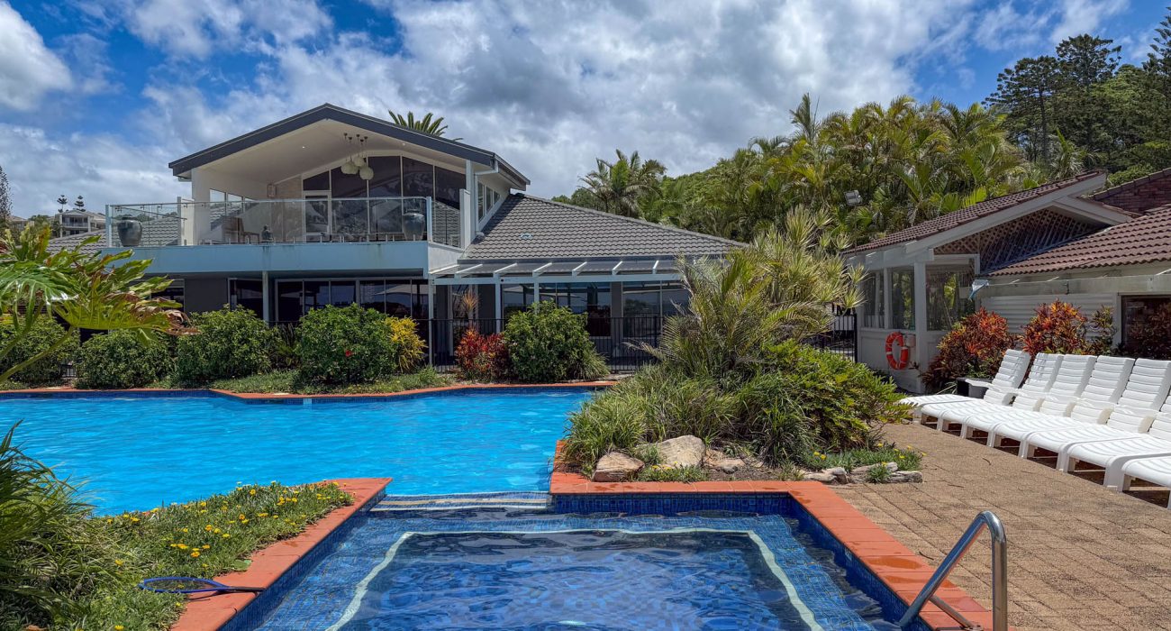 Superb uninterrupted beach and rain forest views are a feature of this first floor villa. The 220 msq of internal space includes 3 bedrooms, 2 with king size beds and a third with 4 bunk beds. There are two bathrooms, and a separate laundry with washing machine and dryer. A well equipped kitchen includes oven, stove top, “Nespresso” coffee machine, fridge, microwave and dishwasher. Relax in the comfort with ceiling fans, reverse cycle air conditioning and two flat screen TV’s (one which is a smart TV), Blue-ray player and Blue-tooth speaker for your entertainment. Complimentary WiFi. Enjoy comfortable dining for eight or step out onto the charming patio for al fresco dining, with the waves breaking just metres away and the black cockatoos calling from the rain forest across the creek.