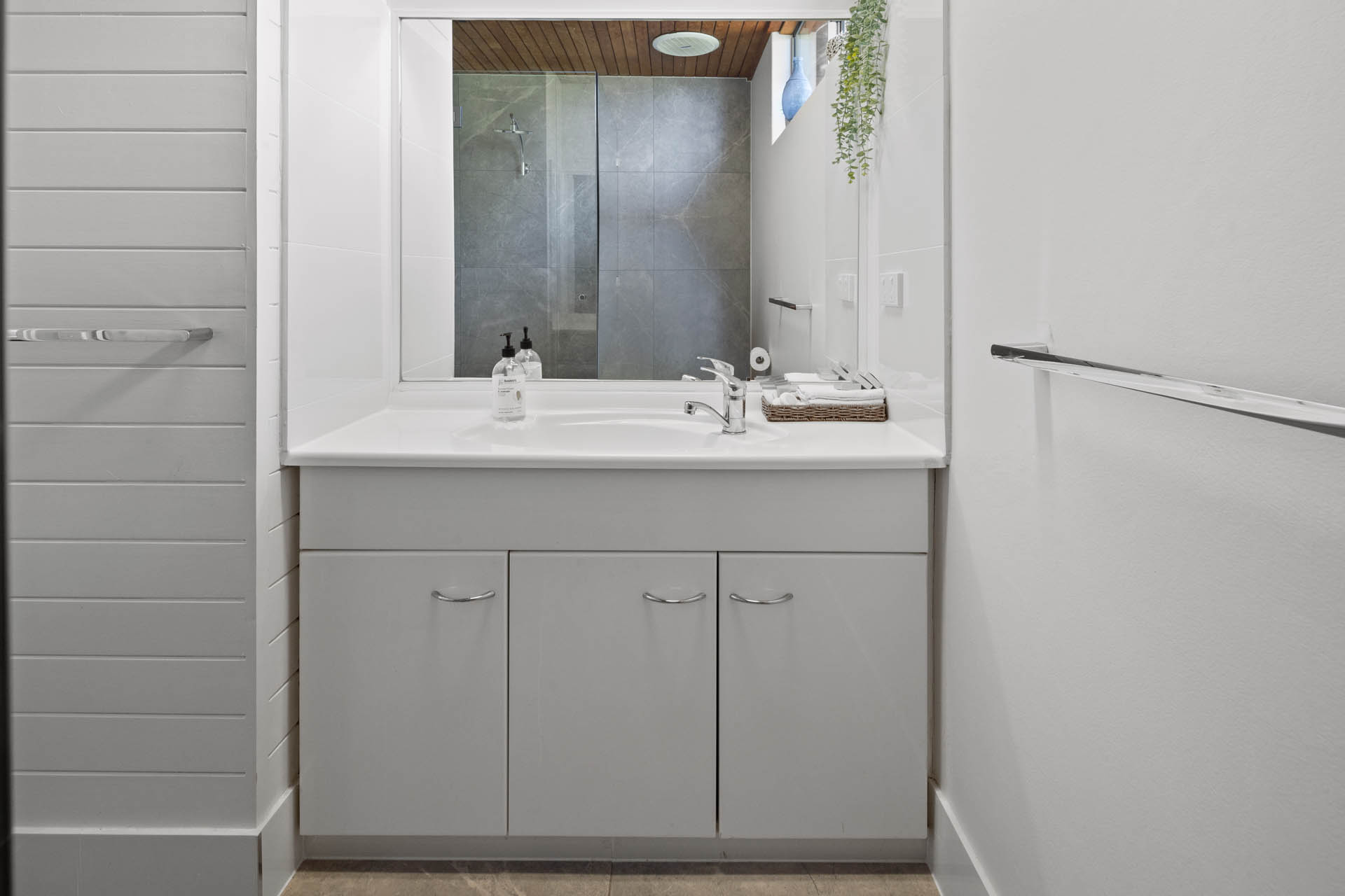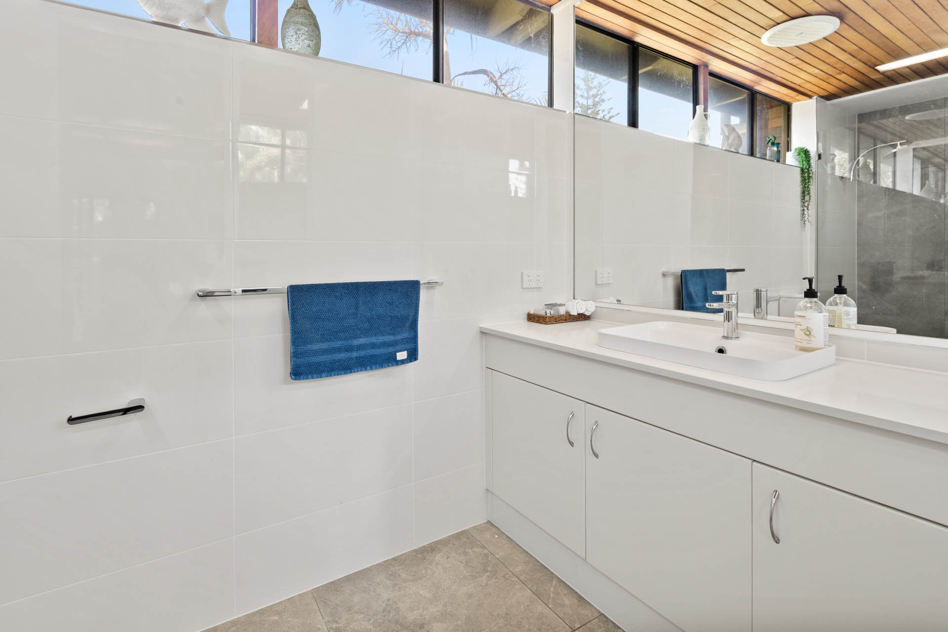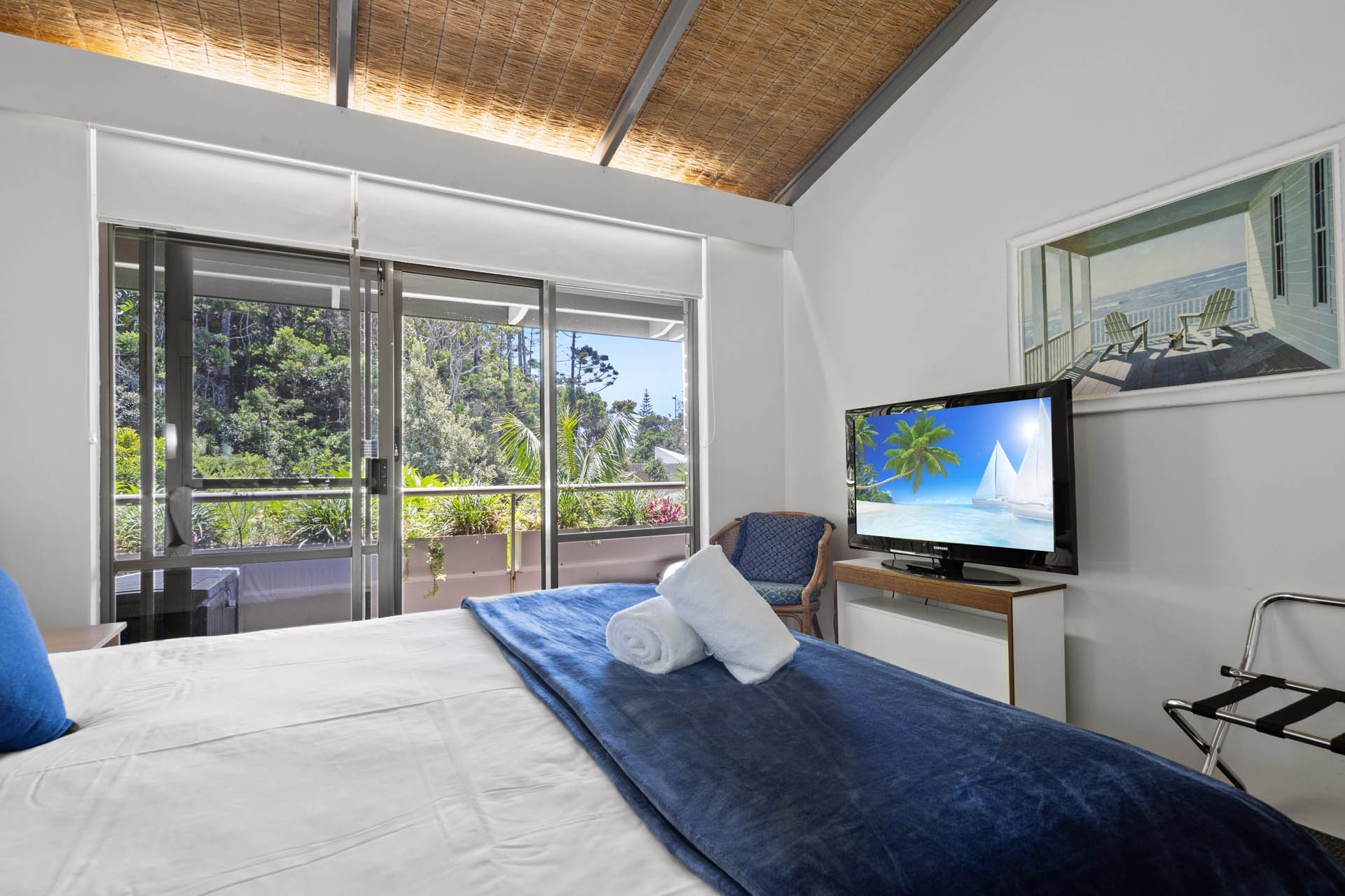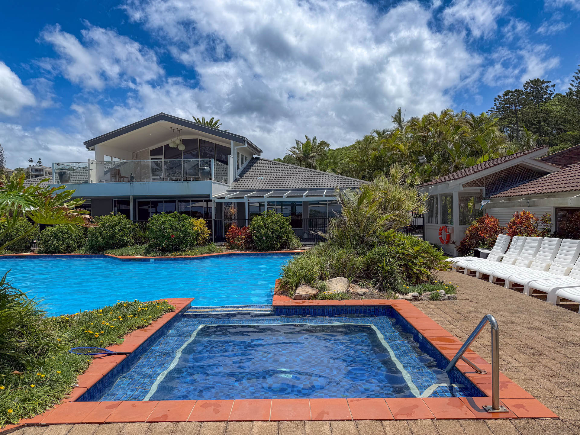 Superb uninterrupted beach and rain forest views are a feature of this first floor villa. The 220 msq of internal space includes 3 bedrooms, 2 with king size beds and a third with 4 bunk beds. There are two bathrooms, and a separate laundry with washing machine and dryer. A well equipped kitchen includes oven, stove top, “Nespresso” coffee machine, fridge, microwave and dishwasher. Relax in the comfort with ceiling fans, reverse cycle air conditioning and two flat screen TV’s (one which is a smart TV), Blue-ray player and Blue-tooth speaker for your entertainment. Complimentary WiFi. Enjoy comfortable dining for eight or step out onto the charming patio for al fresco dining, with the waves breaking just metres away and the black cockatoos calling from the rain forest across the creek.